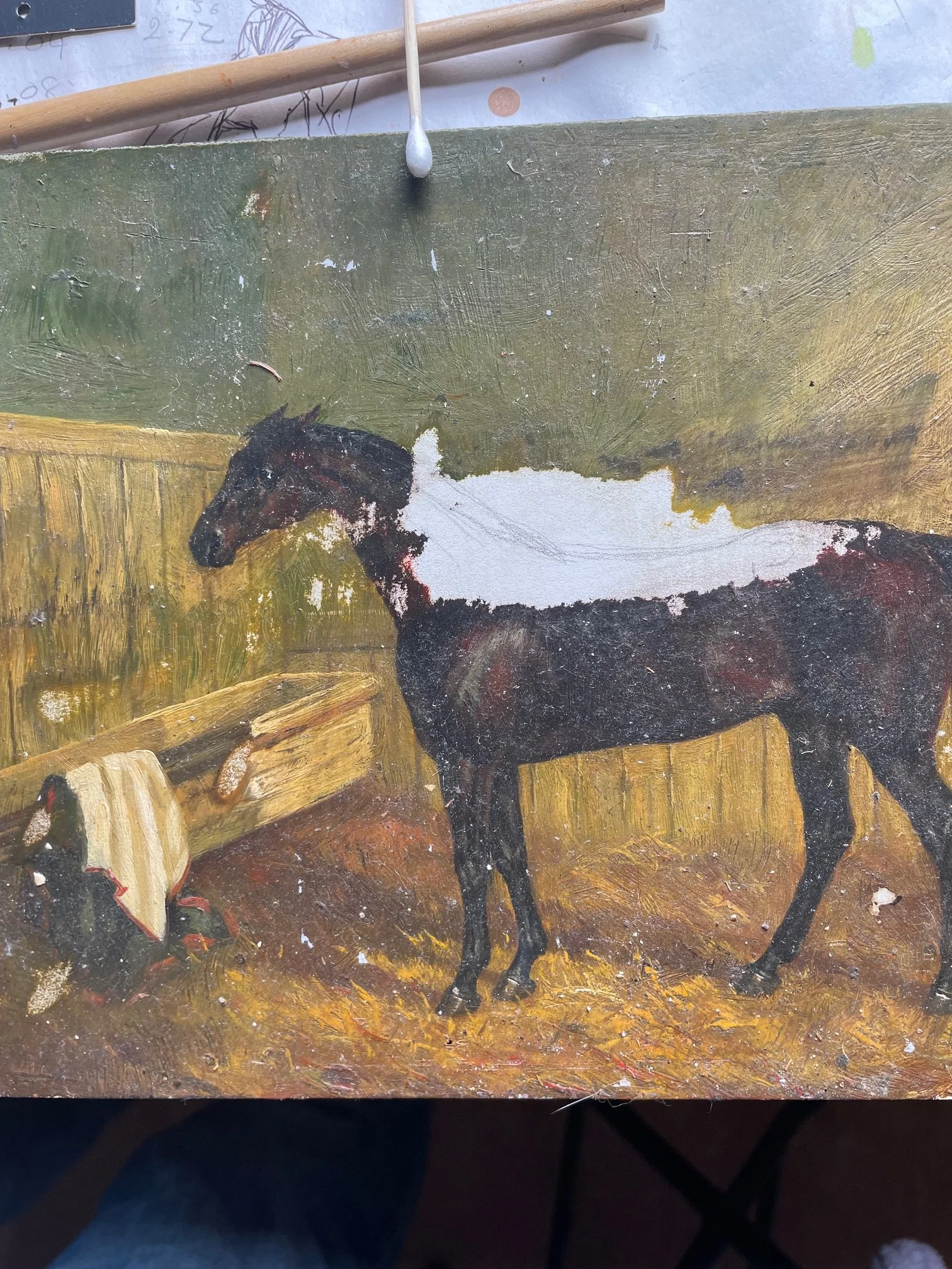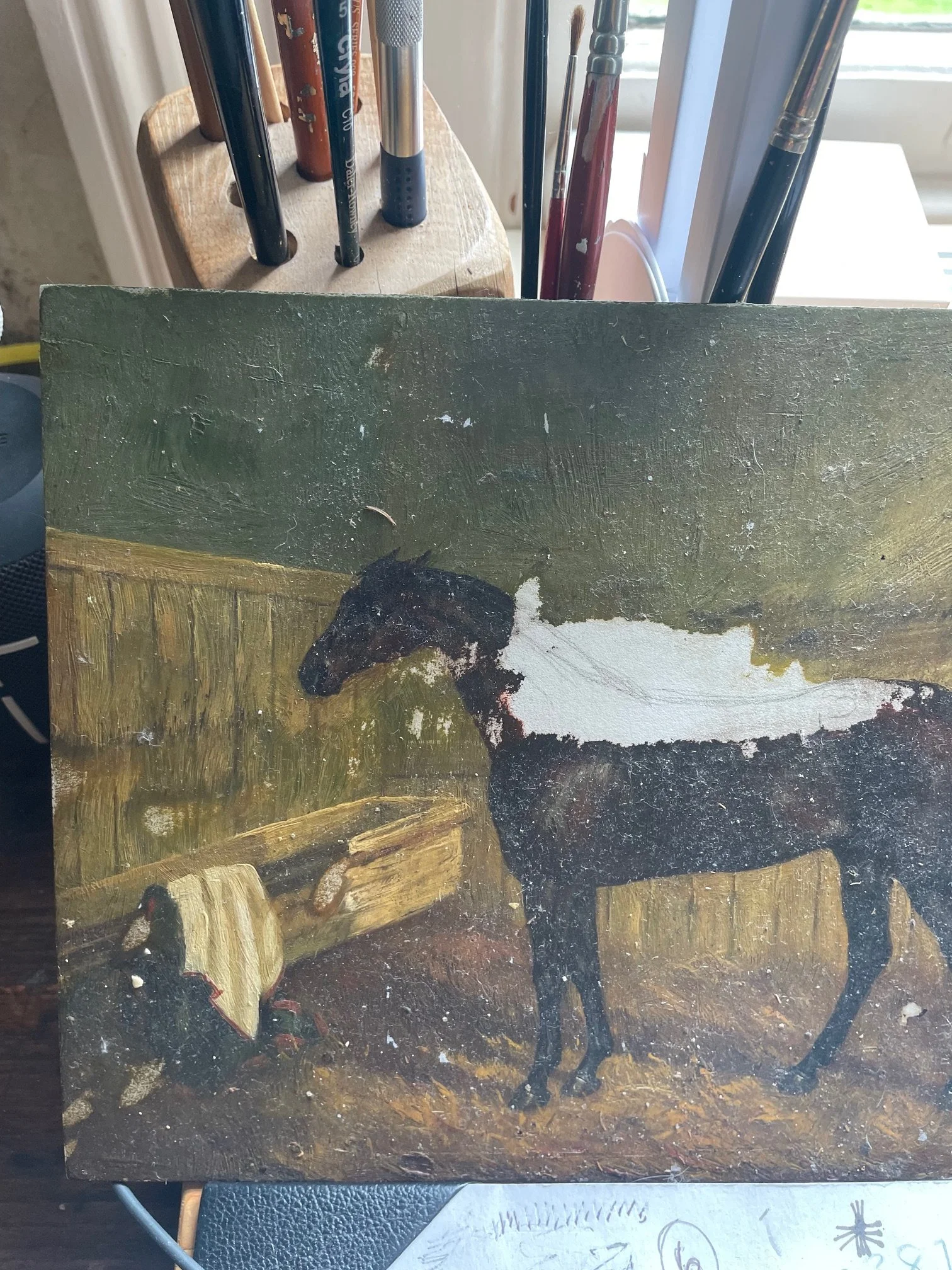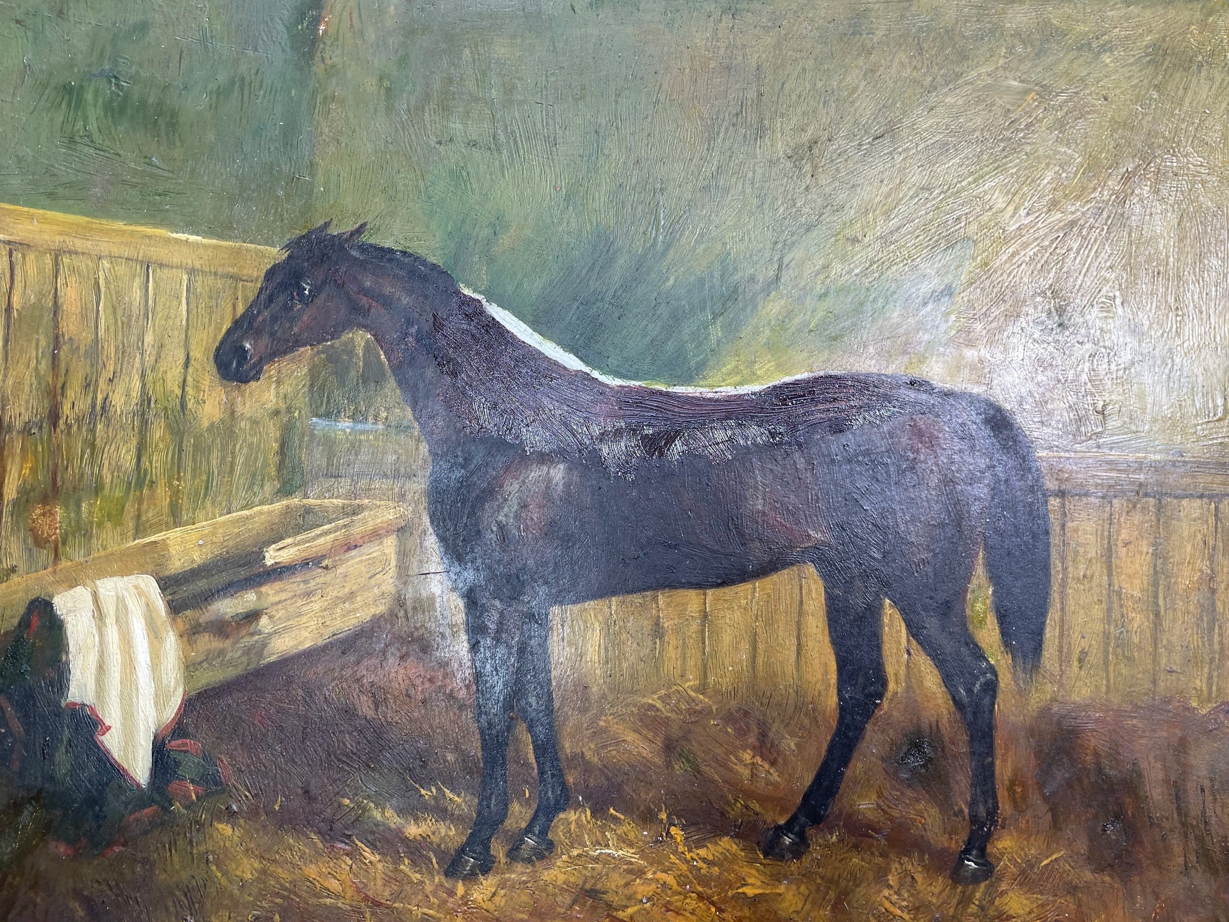When my father died, my sister and I had to clear his house. We gave his tools and wood veneers to other craftsmen and found good homes for all his possessions. Then in the kitchen I found a painting - oil on board -of a racehorse. A jobbing artist had captured the bay’s portrait. His horse blanket draped on a stand. A shaft of light illuminating the scene. It was, inevitably , in a terrible state. Whole sections of paint was lost, and yet and yet, the painting had held on. Someone had kept it, somewhere, long enough for my father to find it. He shoved it onto a shelf where it knocked about with dog food and cooking oils.